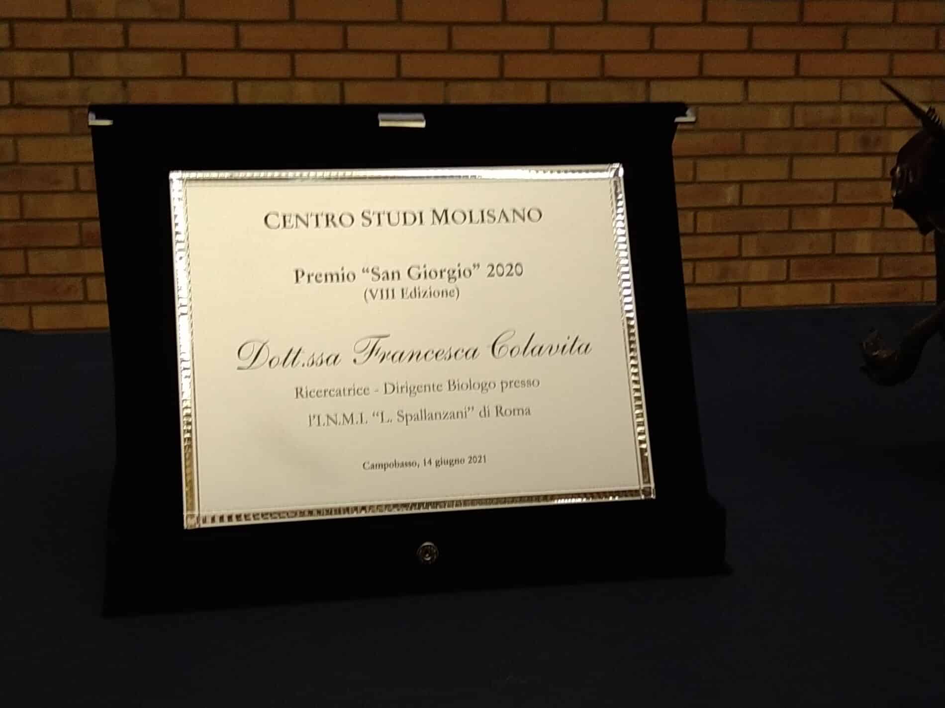 Campobasso, si è svolta oggi pomeriggio, presso l’Aula Magna, dell’Università degli Studi del Molise, la cerimonia di consegna del Premio San Giorgio 2020, assegnato dal Centro Studi Molisano nel mese di dicembre u.s. alla ricercatrice e biologa molisana Francesca Colavita dell’I.N.M.I. “Spallanzani” di Roma.