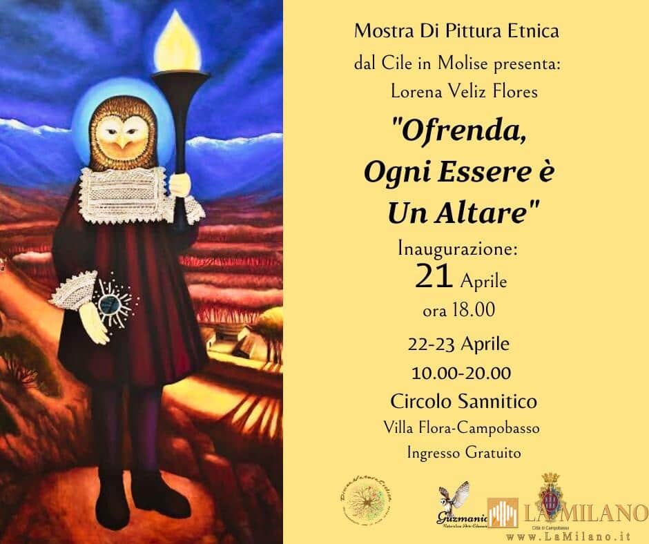 Sarà inaugurata alle ore 18.00 di venerdì 21 aprile, presso il Circolo Sannitico di Campobasso, la mostra di pittura etnica “Ofrenda, ogni Essere è un Altare”. #lorenavelizflores #campobasso #mostra …CONTINUA A LEGGERE