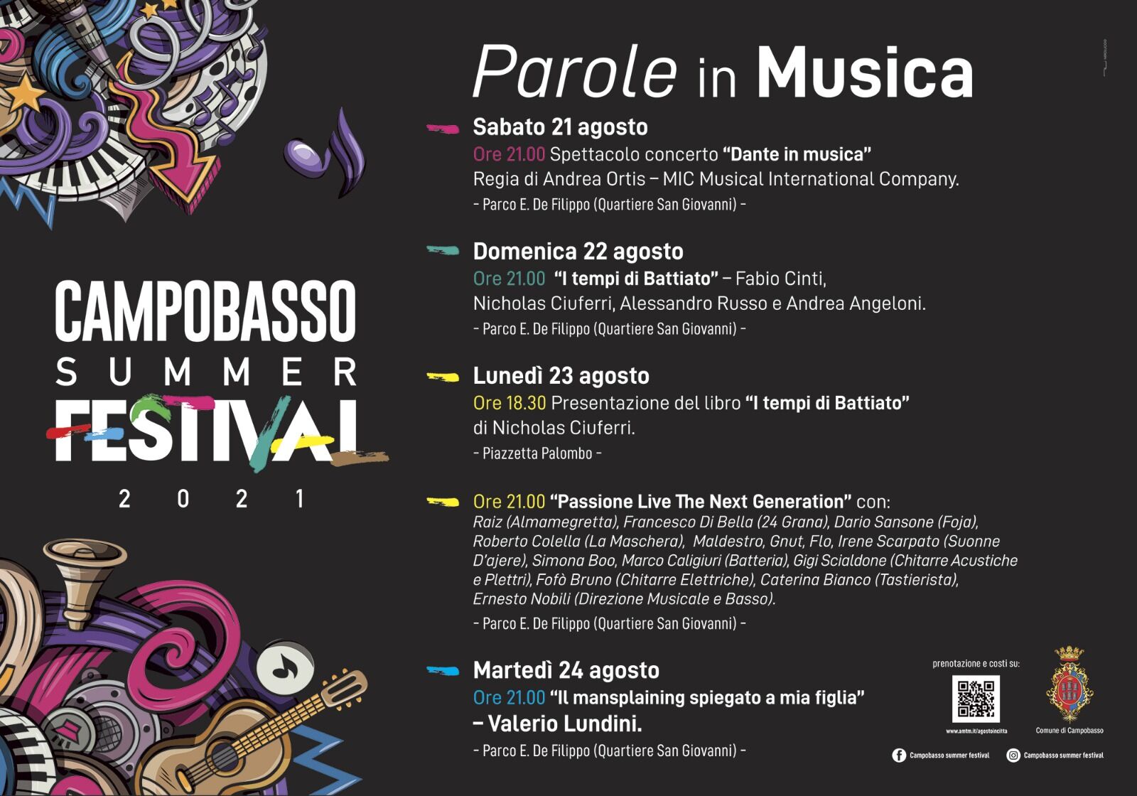 Lunedì 23 agosto, il Summer Festival si sdoppia, infatti, il pomeriggio, alle ore 18.30 a Piazzetta Palombo si terrà la presentazione dell’ultimo lavoro letterario di Ciuferri, ovvero, “I tempi di Battiato”, mentre la sera, al parco E. De Filippo, alle ore 21.00, ci sarà lo spettacolo musicale “Passione Live – The next generation”, uno spettacolo attuale ed unico, capace di stupire, emozionare e far divertire il pubblico ma soprattutto di fargli scoprire il desiderio di perdersi nel cuore pulsante di una città senza tempo, Napoli, dove la musica è espressione e parte integrante di una cultura unica al mondo. Dario Sansone (Foja), Roberto Colella (La Maschera), Maldestro, Gnut, Flo, Irene Scarpato (Suonne d’Ajere), Simona Boo, protagonisti dello spettacolo, saranno accompagnati sul palco da musicisti d’eccellenza e ci sarà con loro, come special guest, Raiz (Almamegretta). Una scaletta ricca di sorprese, duetti e riproposizione di classici e tanti altri brani, per circa 2 ore di un intenso e travolgente spettacolo.
